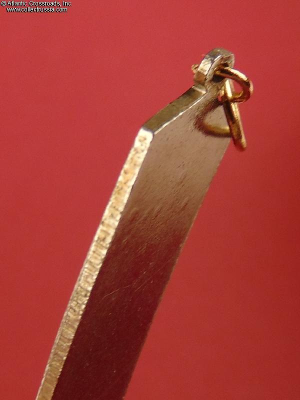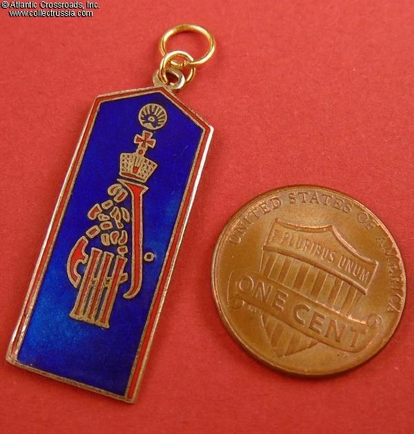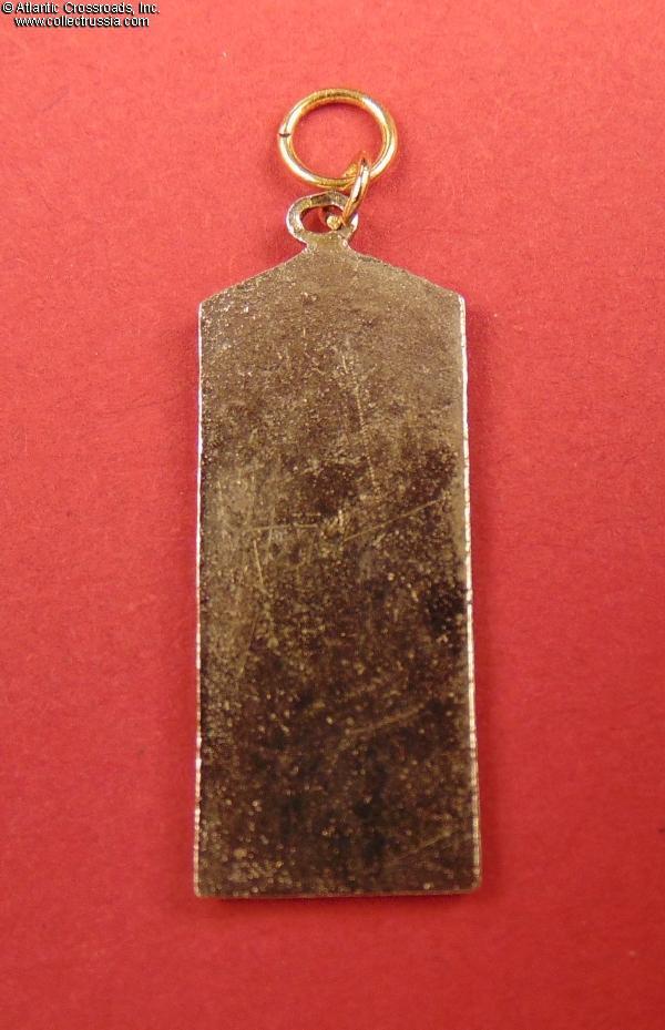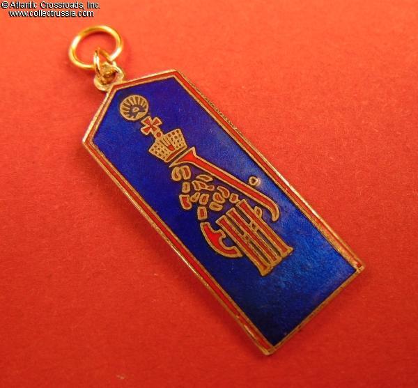 White metal (possibly silver-plated brass), enamels. Measures 33.8 mm in height including the eyelet, 12.9 mm in width; weighs 4.0 g without the connecting links. The reverse is blank. The enamelwork is of very high quality, and the details of the Alexander III's cypher are very precise despite the small size of the jetton.