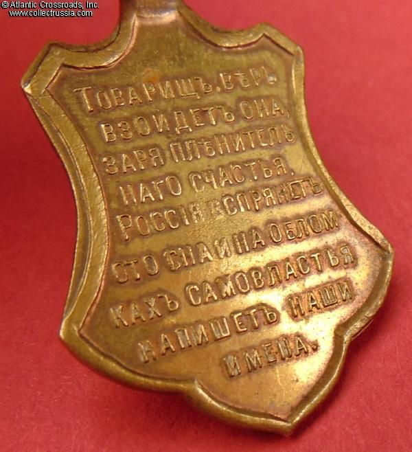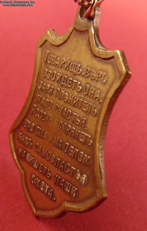 In brass, of less common shape (as opposed to the usual round jettons). Measures 34.7 mm in height (incl. eyelet), 25.6 mm in width; weighs 5.3 g without the connecting links. On the obverse is a female figure representing Russia holding a banner and shield with the date "1917". Along the top is a raised inscription "Freedom" with the last letter omitted, probably an inadvertent error on the side of the designer of the jetton.