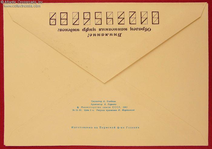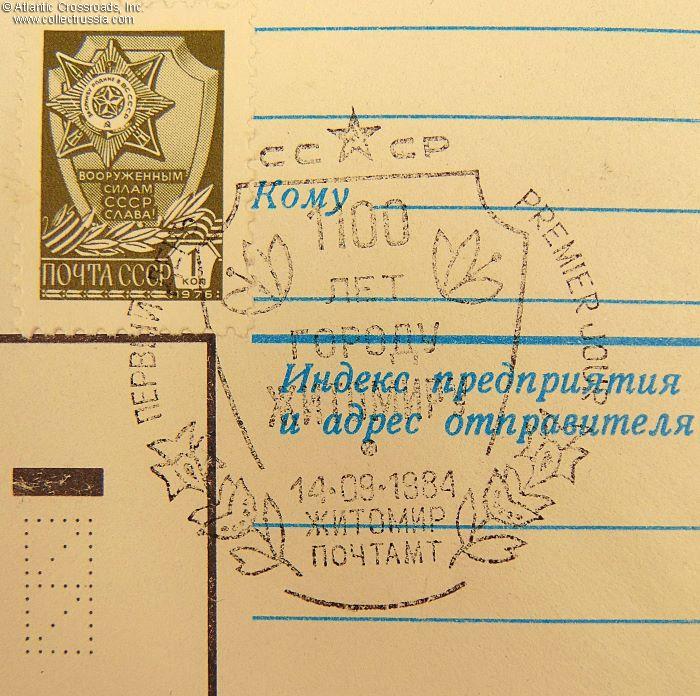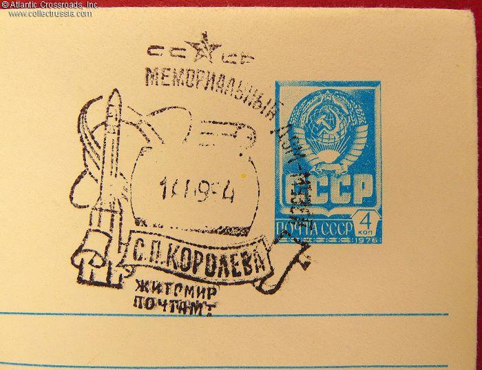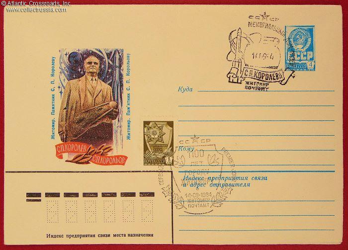 The size is 6 ¼" x 4 ½", postally unused, published by the Ministry of Communications of the USSR, circulation unknown. The pre-printed postal stamp is canceled with the First Day stamp issued by the Zhitomir Post Office commemorating not so much Sergey Korolev, Chief Designer of the Soviet space craft and the leading figure of the entire Soviet space exploration program, as the monument to him, erected in the city of Zhitomir. The artwork in the left pane of the obverse shows an artist's rendition of the monument. A second postal stamp, placed in an unusual spot and glorifying the Soviet Armed Forces, is canceled with the First Day stamp commemorating the 1100th anniversary of the city of Zhitomir in Ukraine, issued by the Zhitomir Post Office and dated 14 September 1984. A confusing but entertaining effort of the Zhitomir Post Office to create something resembling a first day cover.