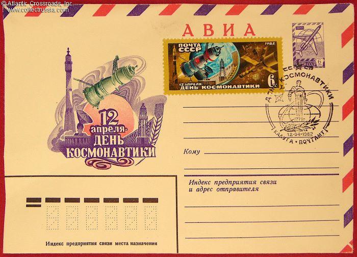 The size is 6 ¼" x 4 ½", published by the Ministry of Communications of the USSR, circulation unknown. The pre-printed postal stamp and the large commemorative postal stamp are canceled with the First Day stamp issued by the Kaluga post office, dated 12 April 1982. April 12th, the date of Yuri Gagarin's first manned space flight was celebrated in the Soviet Union as Cosmonautics Day.