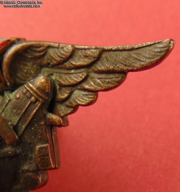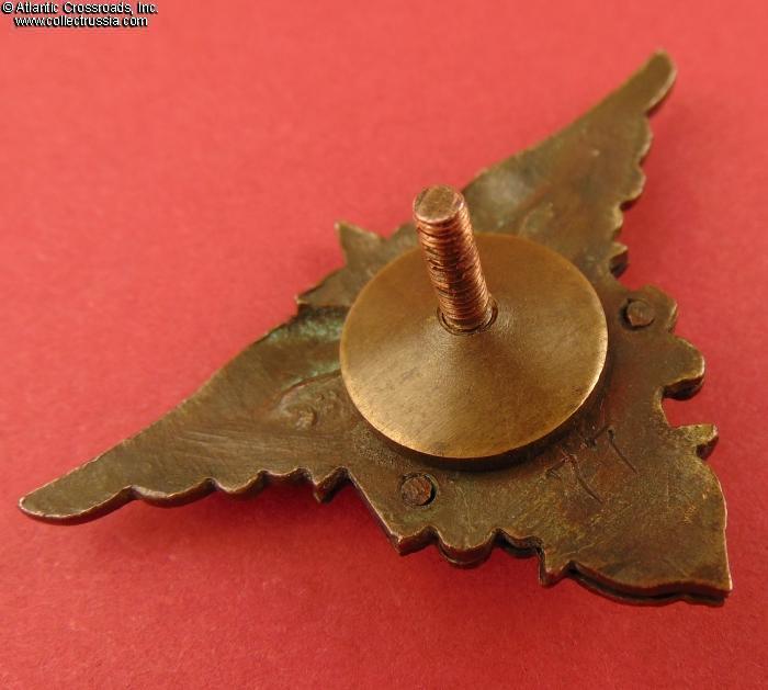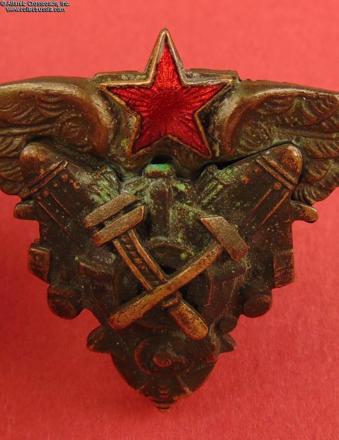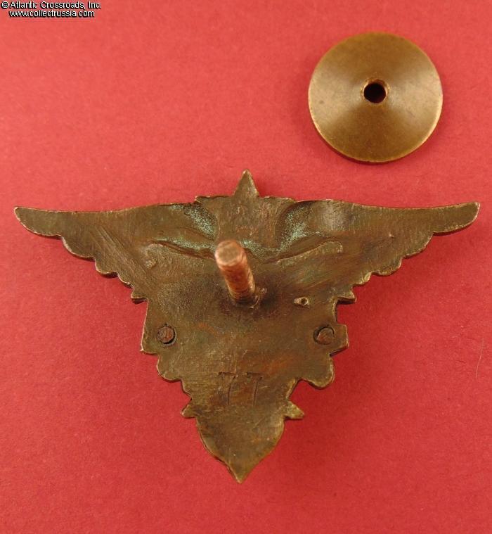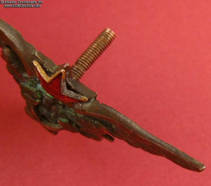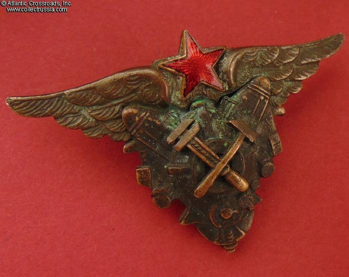 Brass, silver plating, enamel. Measures 35.6 mm in height, 53.6 mm in width; weighs 13.1 g without the screw plate. Massive riveted four- piece construction: the enameled red star, technical branch emblem of hammer and wrench, and aircraft engine are separate parts superimposed on the winged base. Engraved serial number to the reverse.