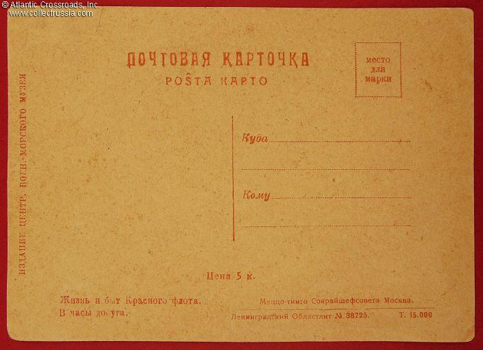 The size is continental standard 6" x 4", postally unused and unmarked, published by the Central Naval Museum, Leningrad. Circulation 15,000, very low by Soviet standards.