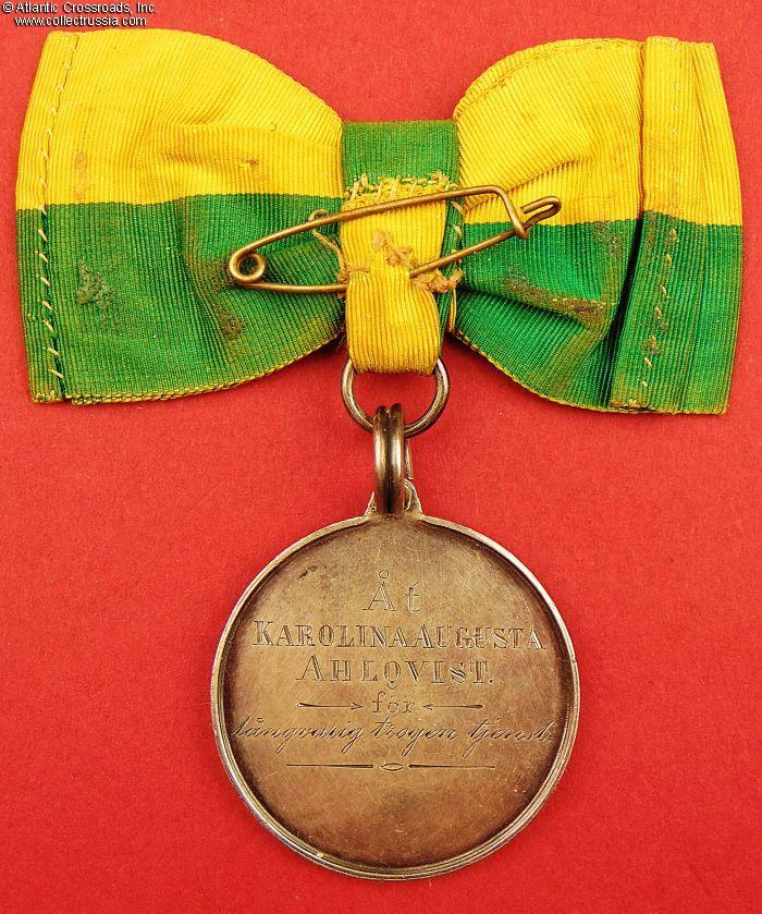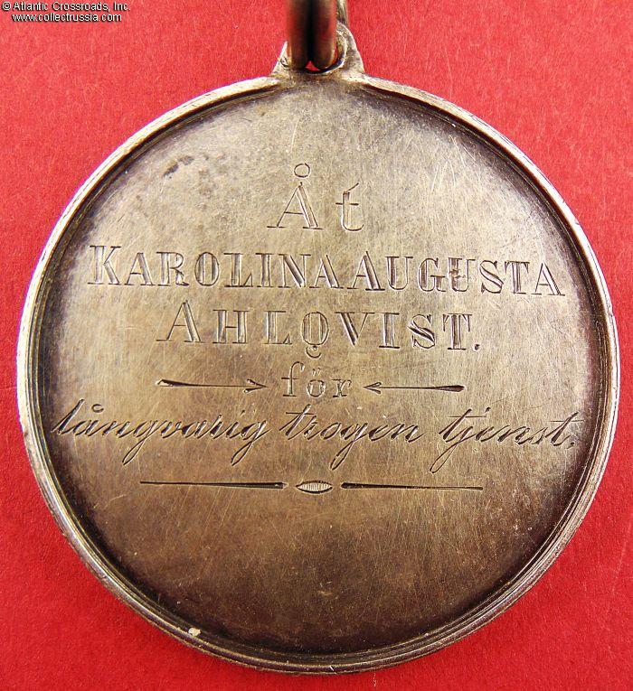In silver, measures 35.8 mm in diameter, weighs 17.9 g including the double link ring. The obverse has a raised inscription "KL SV PATR SALISK". The reverse is engraved with "At KAROLINA AUGUSTA AHLQVIST, for langvarig trogen tjenst." The medal is suspended from a bowtie ribbon, suggesting that it was awarded to a woman.