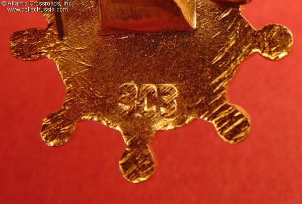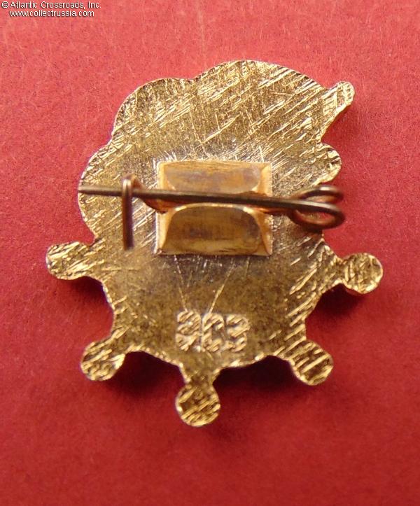 Anodized aluminum, paint, lacquer; measures 18.3 mm in height, 16.0 mm in width. The reverse shows the logo ЗСЗ ("ZSZ") of the Moscow Sports Badges Factory. Excellent condition.
