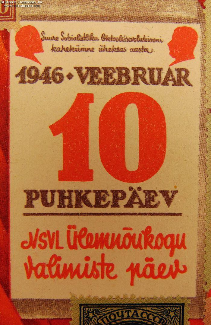 The size is continental standard 6" x 4", postally unused and possibly not meant to be mailed. Published by the OKTOBER Publishing House, Tallinn, circulation 30,000. The obverse features the 10 February 1946 calendar page, inscribed in Estonian language in red "NSVL Ulemnoukogu valimiste paev" ("Election Day of the USSR Supreme Soviet"). It appears that this postcard was possibly meant as a collectible item because of the five rare postal stamps affixed to the obverse, showing some of the highest military and civilian decorations