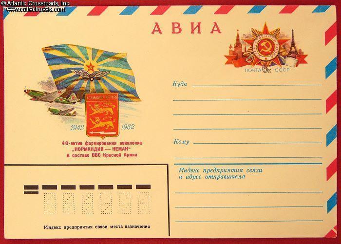 The size is 6 ½" x 4 ½", with a pre-printed postal stamp. Postally unused, published by the Ministry of Communications of the USSR, circulation unknown. The special-issue postal stamp features all the symbols of the Normandie-Nieman Air Force Regiment: the Spasskaya Clock Tower of the Moscow Kremlin, the Eiffel Tower of Paris, and the Order of the Patriotic War. In March of 1942, the Free France National Committee offered the Soviet government to send a group of French pilots and avia mechanics to fight against the Nazi Germany. It was this offer and seventeen French pilots sent to the Soviet Union that soon gave birth to the famous Normandie-Nieman Fighter Regiment which fought in WW2 as part of the Soviet Air Force.