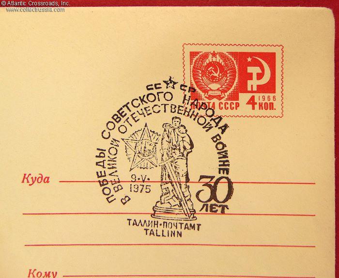 The size is 6 ½" x 4 ½", with a pre-printed postal stamp. Postally unused, published by the Ministry of Communications of the USSR, circulation unknown. The stamp is canceled with the First Day Cover issued by the Tallinn (Estonian SSR) Post Office, dated 9 May 1975, in celebration of the 30th anniversary of victory in the Patriotic War of 1941-1945. The artwork in the left obverse pane shows a portrait of Zoya Kosmodemyanskaya, the first woman - Hero of the Soviet Union. Serving in the Red Army in a reconnaissance group specializing in subversive activity behind enemy lines, she was tasked in November 1941 with setting fire to several villages from which the Red Army had retreated, to deprive German troops from a place to rest. Needless to say, those villages still had their Soviet population in place. With or without the help from the peasants whose houses Zoya set fire to, she was captured by the Nazis, tortured and executed.