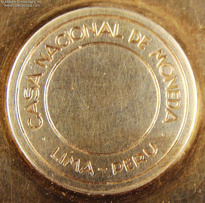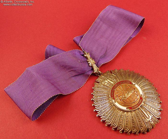 Silver gilt, enamels, 62.1 mm in height (incl. eyelet), 53.4 mm in width. Weighs 42.2 g. Suspended from a decorative suspension loop through which a purple moiré silk neck ribbon is threaded. The center medallion is encircled in white-enameled ring with two red-enameled banners, the top of which is inscribed with the full name of the order, AL MERITO POR SERVICIOS DISTINGUIDOS, while the bottom banner spells out REPUBLICA PERUANA. The reverse is in silver gilt, with the cartouche in the center maker-marked CASA NACIONAL DE MONEDA, LIMA PERU.