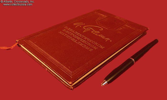 Small format measuring 4 ½" x 6 ¾", in burgundy oilcloth-wrapped hard cover with Stalin's portrait embossed top center and a facsimile of his signature under it, in gold. Published on Stalin's 70th birthday anniversary by the State Publishing House of Political Literature, circulation 50,000, extremely low by Soviet standards and especially considering the author. The title page has a handwritten notation with a library inventory number.