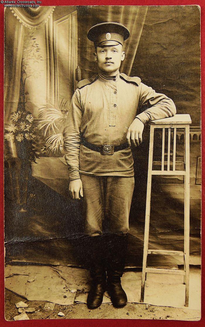 The size is standard 3 ½" x 5 ½", postally unused and unmarked. The cabinet photo presents a full standing portrait of a young man in the Imperial Russian Army uniform with two stripes of a sergeant on the shoulder boards. The verso is inscribed in Latvian, loosely translated as "Remember from the past" and dated 24 October 1916.