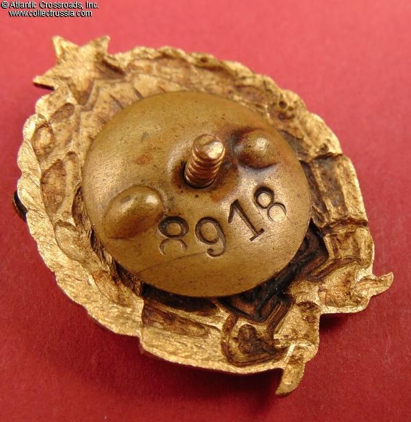 In outstanding, excellent condition, extraordinary for any Soviet badge from the 1920s. The enamel is completely free of any wear visible even under a 10x magnification and exhibits a magnificent luster throughout. The gilt finish is beautifully preserved and bright, especially on the obverse. The details of the artwork are literally pristine.