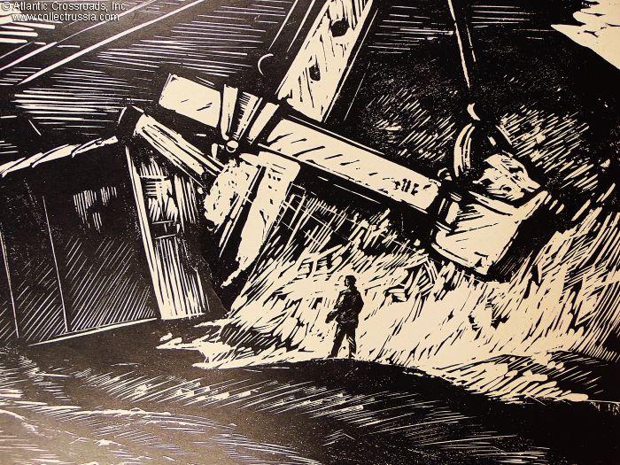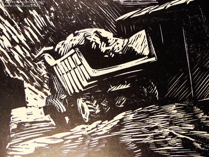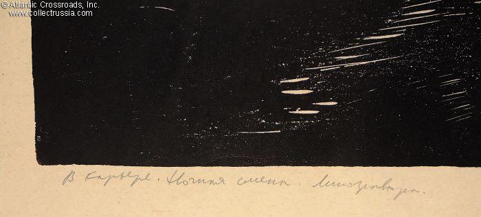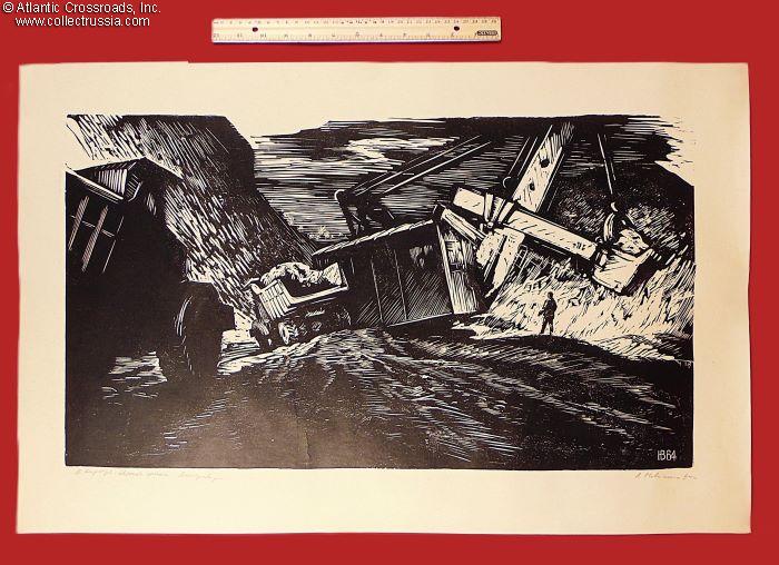 Large format: the image measures 26 ½" x 14 ½", total size is 31" x 19 ¾". The lone figure of a worker is completely dwarfed by the huge machinery rumbling through its unstoppable toil in the dead of the night. Even though the man is in the only brightly lit spot, he is not the focal point of this artwork. The mammoth scale of the industry around the man is the hero of this piece of art. The inscription in the artist's hand in the lower left-hand corner under the image reads "In the quarry. Night shift. Linotype." His hand signature and year is in the opposite corner under his initials and year incorporated into the linotype. The inscription on the verso was made by an employee of the Sverdlovsk Regional Artists' Fund when registering the linotype in their inventory. It reads "Novichenko V.A. Price 300 rubles, SRAF, inventory #124-G."