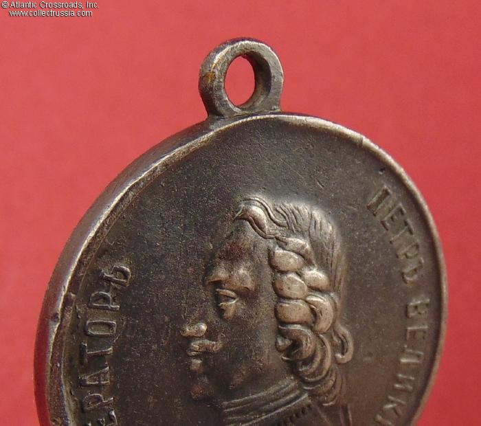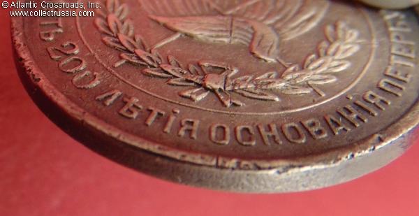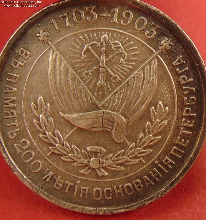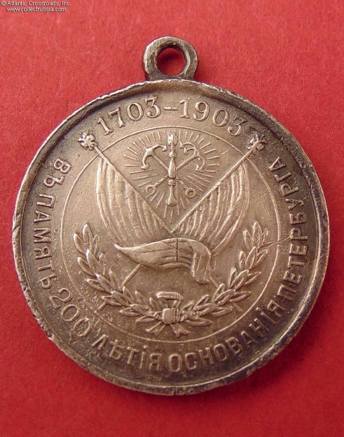 In silver; measures 28.2 mm in height incl. eyelet, 24.5 mm wide; weighs 6.7 g. The obverse features a portrait of Peter I, the founder of the city, and inscription "Emperor Peter the Great". The reverse has the St. Petersburg's coat of arms of crossed anchors and scepter, banners topped with double-headed eagle, and raised inscription "In Commemoration of the 200th Anniversary of the of St Petersburg, 1703-1903.