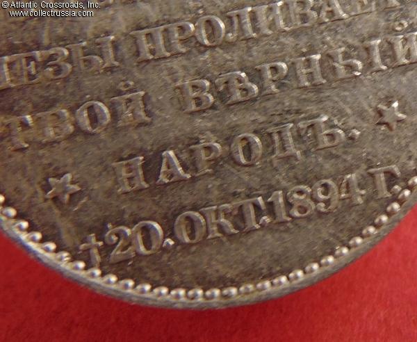 In aluminum, measures 27.9 mm in width; weighs 2.4 g. The obverse has a bas-relief portrait of the late emperor and inscription "Alexander III, Emperor of All Russia". The reverse bears an inscription "The World is Grieving over Your Demise; Your Loyal Nation is Weeping. 20 Oct(ober) 1894".