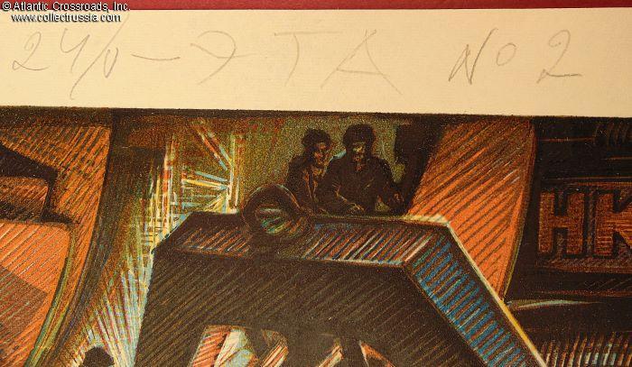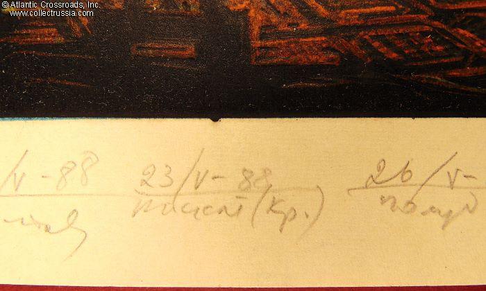 The artwork measures 8" x 6 ¼", the total size of the sheet is 10 ½" x 8". As is the case with most of Novichenko's art, the lithograph depicts a working scene at a large heavy metallurgy or machine-building plant. The artist's hand signature is under the image in the lower right-hand corner. The notations under the image recording the dates when he applied various colors provide a rare insight into the processes that went into creation of this lithograph.