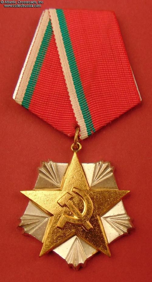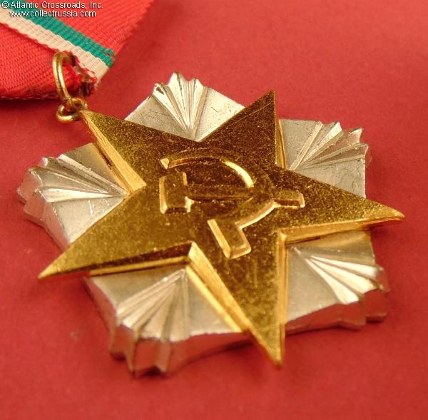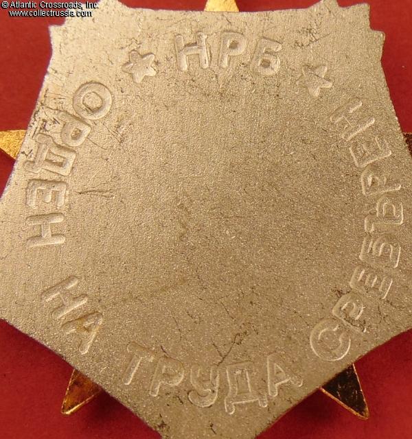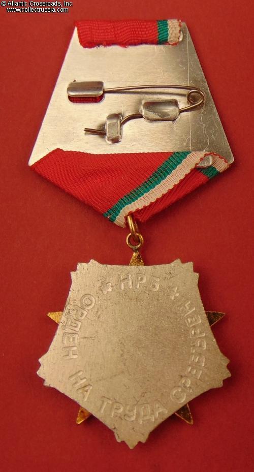 In gilded and silver-plated brass, measures 44.5 mm height incl. eyelet x 40.1 mm in width. A late version featuring rays of the starburst extending beyond the pentagon border. Nicely sculptured massive medallion. The reverse has a stamped inscription "Order of Labor in Silver, NRB (People's Republic of Bulgaria)".