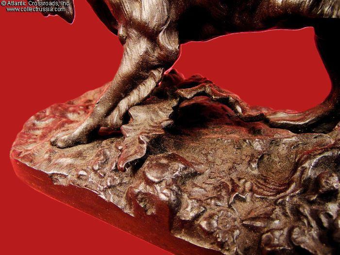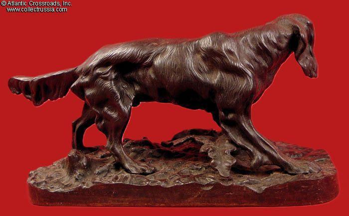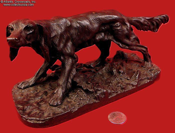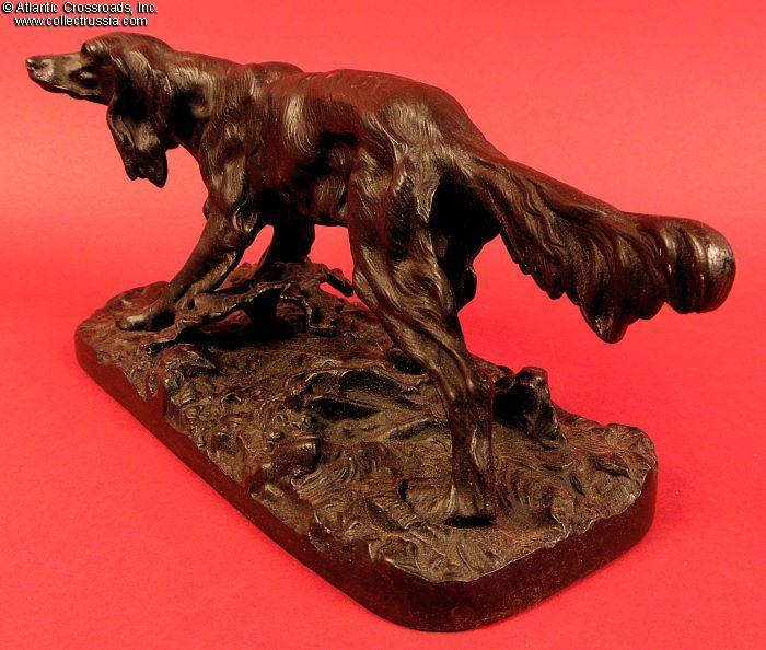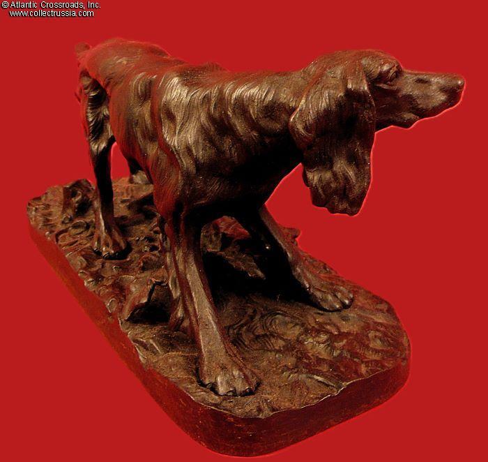 Large and massive, measures 11" wide x 5" high x 4 ½" deep, and weighs nearly 6 lbs. This finely sculpted figurine of a setter on the hunt, sniffing for a bird's scent, is not only beautiful and full of grace and repose. It is scarce in its intact original design and components, showing the large low leafy plant between the dog's front paws, often missing from other casts of this model, and the square nuts on the bottom, used before the Soviet era. This rare find will take a proud place in a collection of Imperial Russian antiques. It is sculpted in much finer detail than later casts of this model created during the Soviet period, and is almost an exact copy of the bronze "Medor" by Pierre Jules Mêne, 19th century French sculptor-animalist famous for his bronze statuettes of animals and hunting scenes.