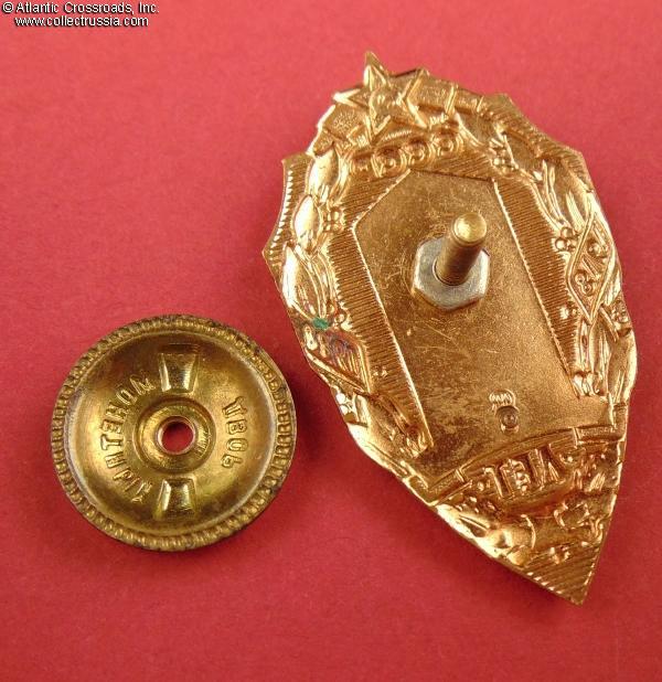 Brass, German silver, enamels, lacquer; riveted 3-piece construction; 49.9 x 28.6 mm; weighs 19.7 g without the screw plate. Shows a round mint mark of the Moscow Mint on the reverse. Quality and design are similar to the "60th Anniversary" badge but without the figure of a border guard.