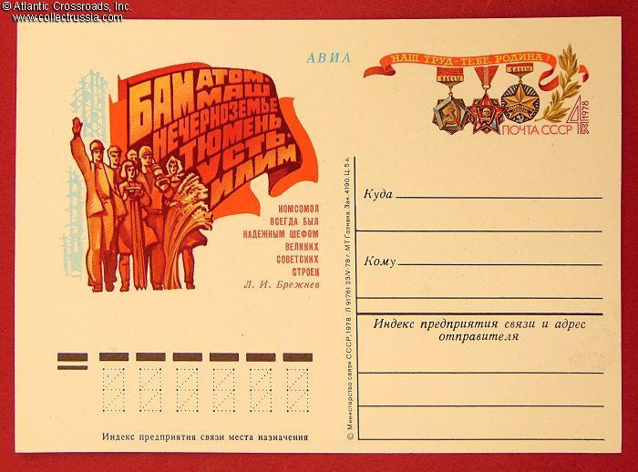 Special-Issue Government Postcard Commemorating Komsomol's participation in the major construction projects of the Brezhnev Era, 1978.