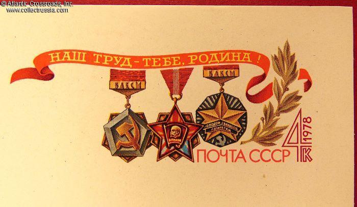 The size is continental standard 6" x 4", postally unused, published by the Ministry of Communications of the USSR, circulation unknown. The obverse features a colorful special edition government postal stamp featuring images of uncommon Komsomol honor badges which were awarded for outstanding achievements in labor projects. The banner in the artwork in the left pane lists some of those projects, such as the Baikal-Amur Railway, ATOMMASH (the largest manufacturer of equipment for nuclear power plants), etc. Brezhnev's quote to the right of the artwork reads "Komsomol has always been a r