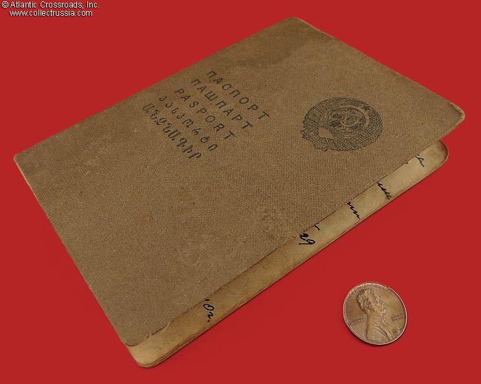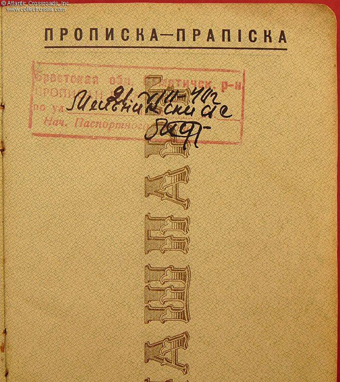 Measures 3 1/21" x 4 ¾", in oilcloth-bound covers. The front cover shows the USSR State Emblem with 11 scrolls, per the number of Soviet socialist republics comprising the Soviet Union from 1937 to 1946. The personal information pages are printed in Russian and Belorussian languages, however, both are filled in in Russian. The passport was issued by the Semyatichi District Police Department of the NKVD of Belorussian SSR, part of the territory of Western Belorussia annexed by the Soviet Union from Poland as per the Molotov-Ribbentrop Non-Aggression Pact between Germany and the USSR. The