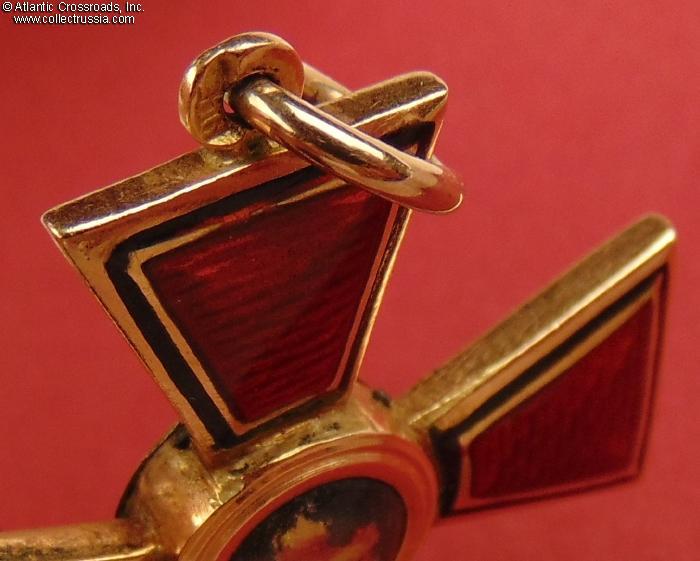 Excellent condition throughout. The red and black enamel on the arms in particular is exceptionally well preserved: it shows a beautiful luster and is completely free of any wear visible to the naked eye; there are only a few microscopic contact marks, all of them totally unnoticeable without magnification. The center medallion on both sides is essentially pristine, with the enamel and artwork perfect and intact. Comes with a connecting loop in what appears to be solid gold (not tested for gold content.)