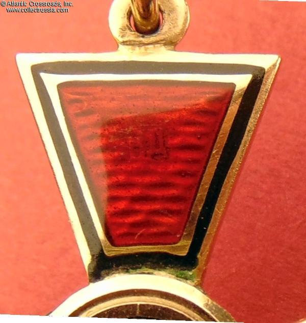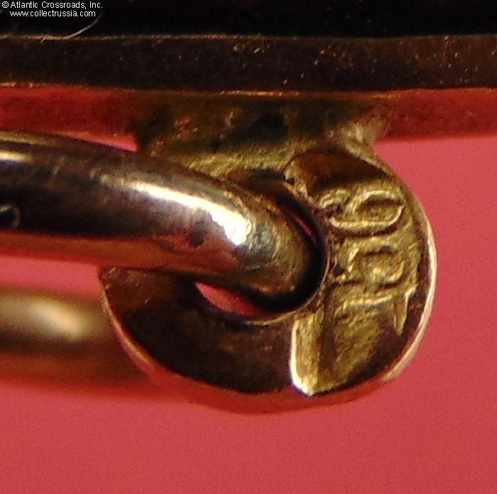 In gold and enamels; measures 38.3 mm in height (incl. eyelet), 34.5 mm in width; weighs 7.7 g not including the connecting loop. The reverse upper arm shows maker mark ВД ("VD", the initials of Vera Dietwald, the widow and heiress of the original owner of the firm Eduard Dietwald). The eyelet has a "56" gold assay inspection hallmark with "Kokoshnik".