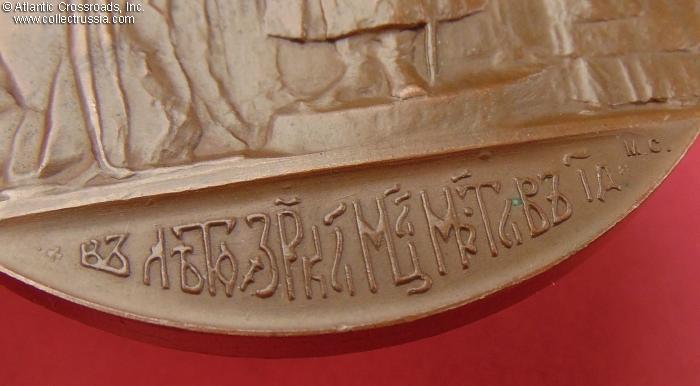 In bronze; measures 74.9 mm wide; weighs approx. 207 g. This medal is larger and heavier than most other Russian table medals of the period.