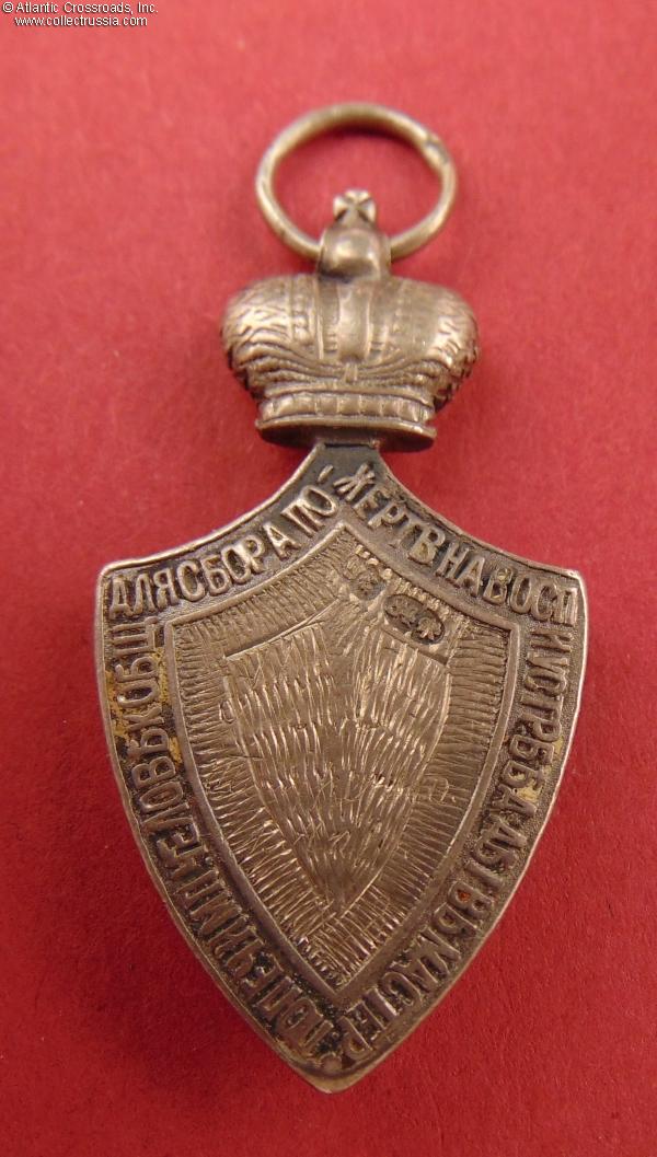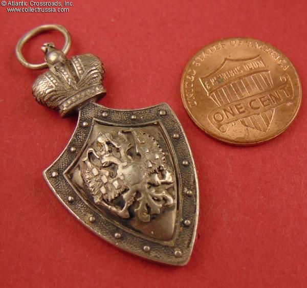 In silver, measures 40.2mm in height not including the jump ring; 21.4 mm in width. The double-headed eagle is a separate superimposed part. The reverse shows the St. Petersburg assay inspection silver hallmark "84" with the anchor and scepter emblem, the style used until 1899. Near the silver hallmark, there is a poorly struck and illegible maker mark.
