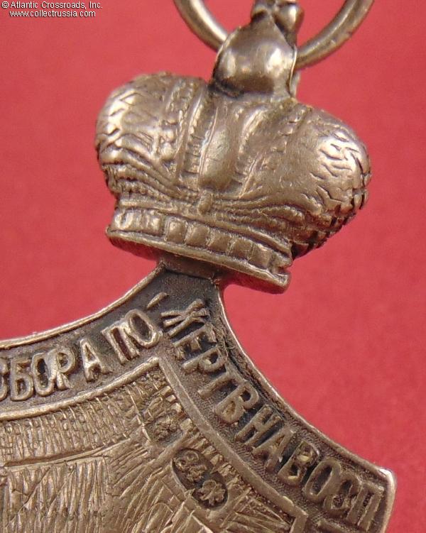 Beside the "camouflaged" name, the jetton is in excellent condition. There is only a very light wear to the raised points of the crown and double-headed eagle, but the details are overall very well-preserved and crisp. There are no dents, significant dings or edge knocks. The silver jump ring is original and shows a matching St. Petersburg hallmark of the anchor and scepter.