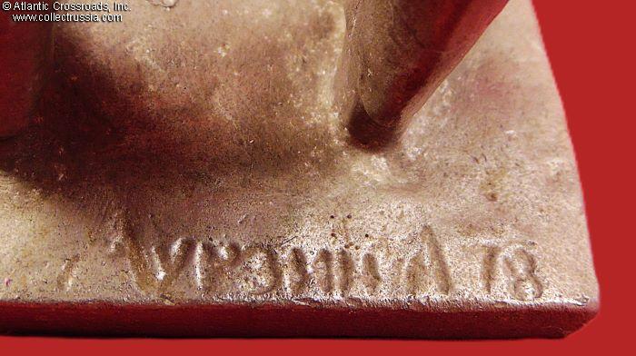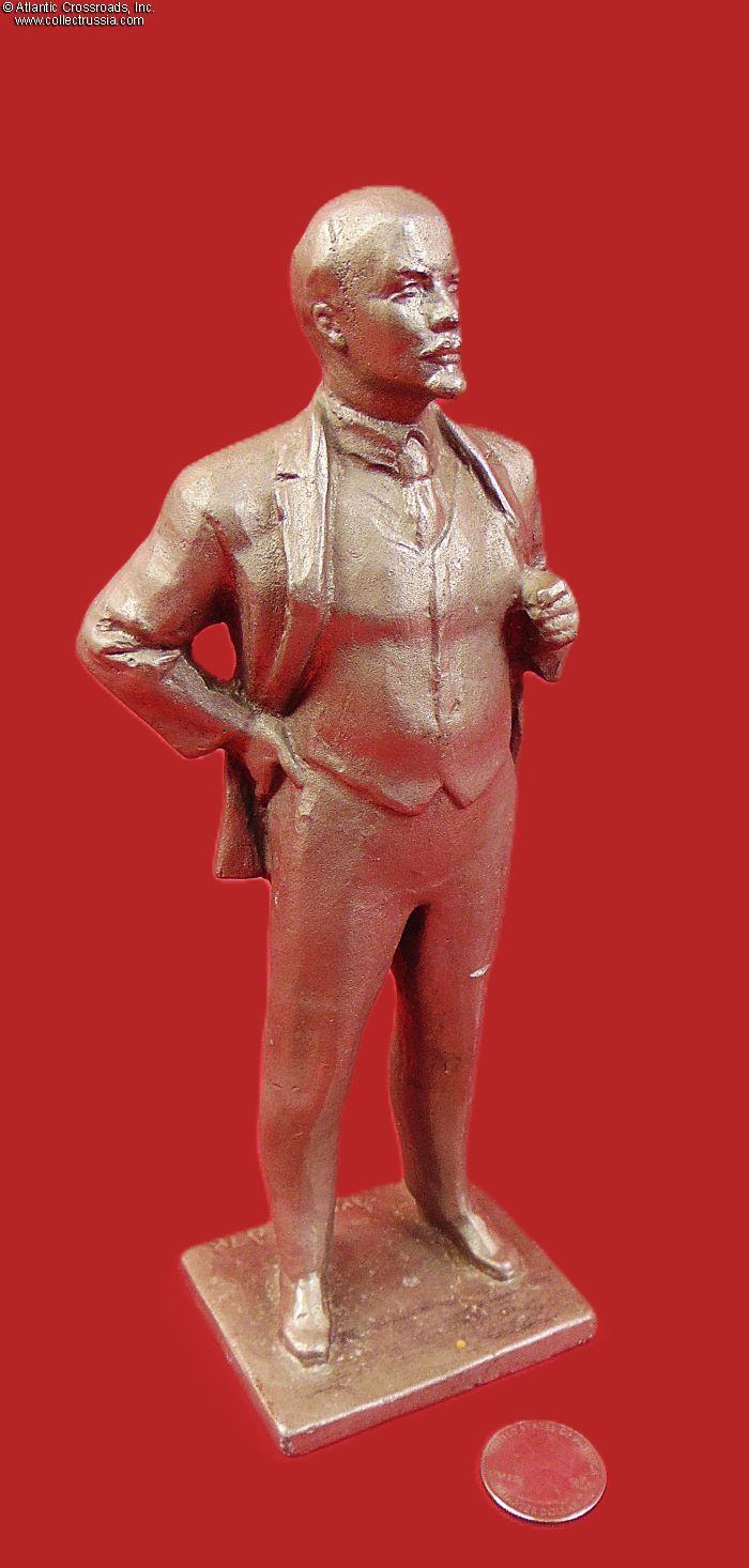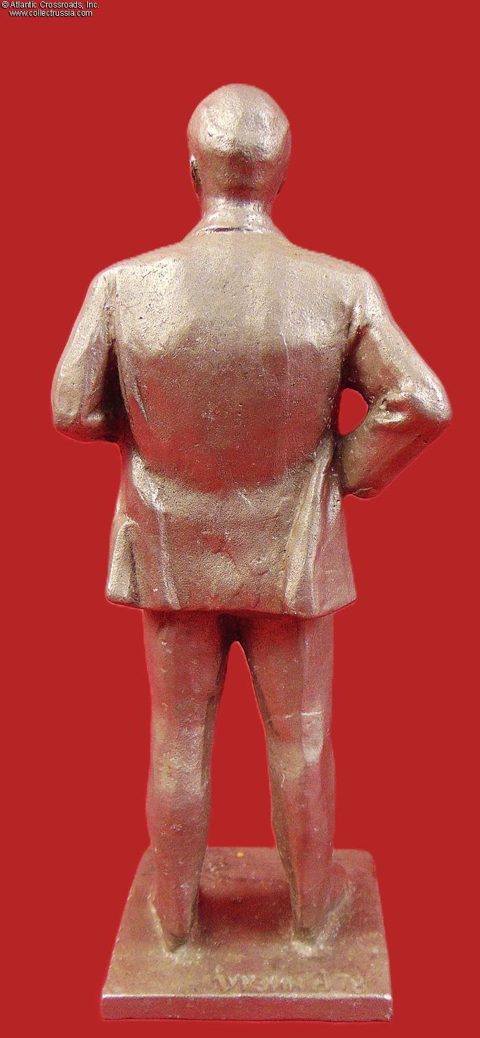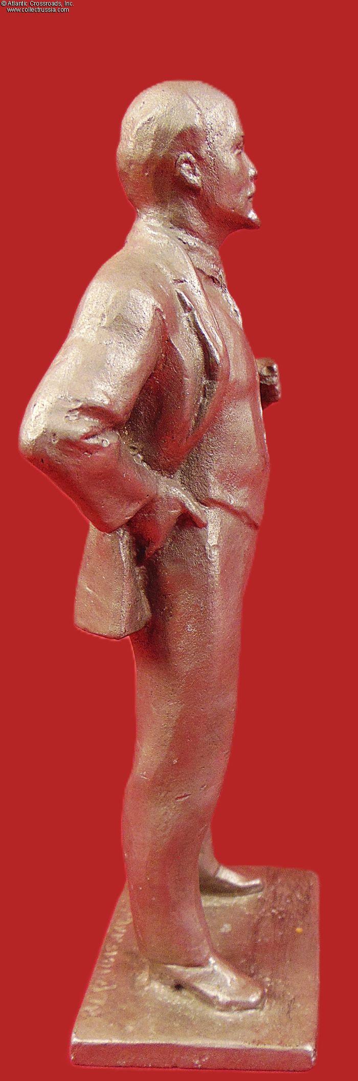 In Silumin alloy, stands 8 ¾" tall, the plinth measures approx. 3" x 2 ½". The sculptor captured Lenin in his signature pose: one arm akimbo, the other's thumb stuck in his vest. Although standing still, Lenin's figure is very dynamic and full of energy, like a coiled spring ready to unleash its energy on the unsuspecting Russia. The sculptor's name and year are seen at the back of the plinth.