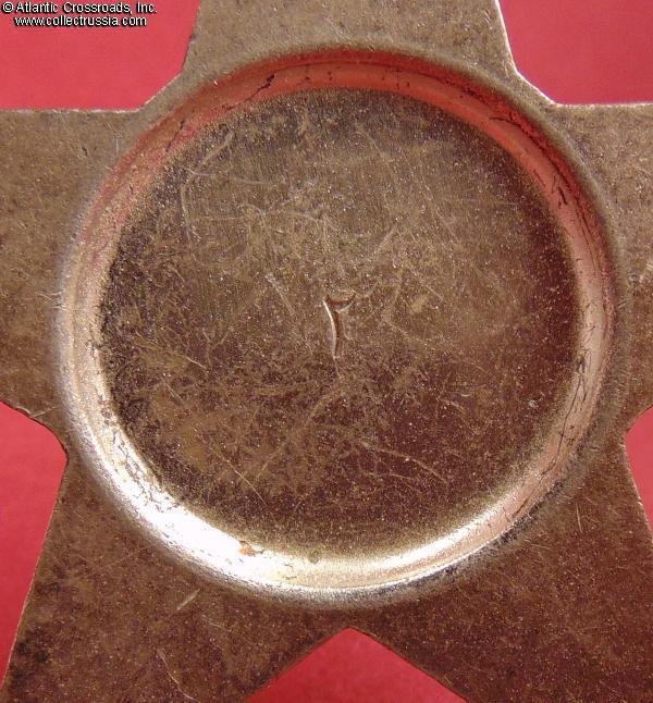 Excellent, near mint condition. The details are perfect, free of noticeable wear; the gilt on the center medallion is extremely bright. The reverse is likewise essentially pristine. Attractive light toning to the silver finish on both sides. Comes on original Soviet suspension device with a scarce correct ribbon in brand new condition. The connecting link appears to be original; its ends are still joined with solder. A perfect example through and through.
