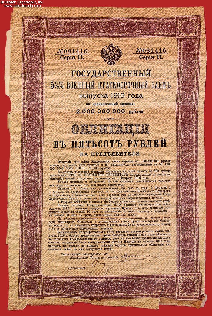 Measures 7 ¾" x 11 ¾"; two watermarked pages, with p.2 containing 20 redemption coupons of which 18 are still present. This is Imperial Russia's short-term State War Bond in 500 ruble denomination, guaranteeing a 5 1/2% interest rate. Series I, issued against authorized capital of 2,000,000,000 rubles, with fully attached redemption coupon fold-out which has eighteen coupons remaining. The certificate is finely engraved and printed on watermarked bank note paper, with the Imperial Russian double-headed eagle at top center. These bonds were issued to help finance the war effort in World War 1. A year after this Bond's issue, the Russian revolution of 1917 occurred, Bolsheviks renounced all the Tsarist debt and disengaged Russia from the war. All remaining redemption coupons irredeemably lost their value.
