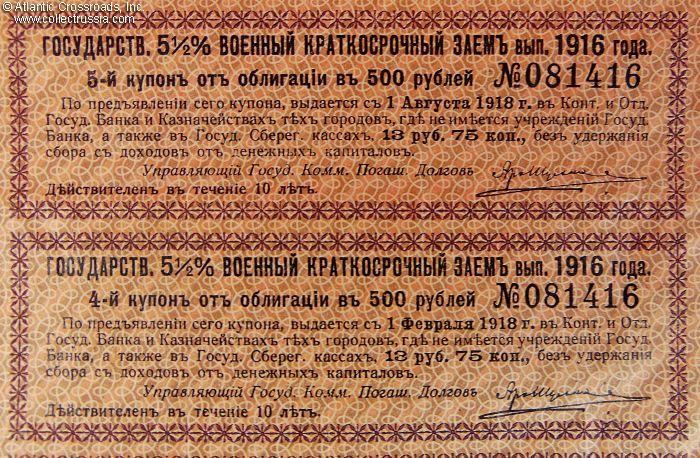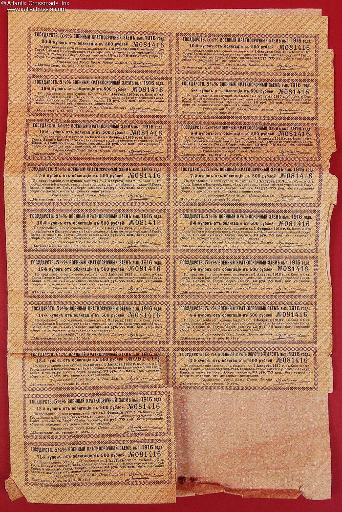 Measures 7 ¾" x 11 ¾"; two watermarked pages, with p.2 containing 20 redemption coupons of which 18 are still present. This is Imperial Russia's short-term State War Bond in 500 ruble denomination, guaranteeing a 5 1/2% interest rate. Series I, issued against authorized capital of 2,000,000,000 rubles, with fully attached redemption coupon fold-out which has eighteen coupons remaining. The certificate is finely engraved and printed on watermarked bank note paper, with the Imperial Russian double-headed eagle at top center. These bonds were issued to help finance the war effort in Worl
