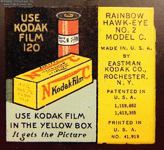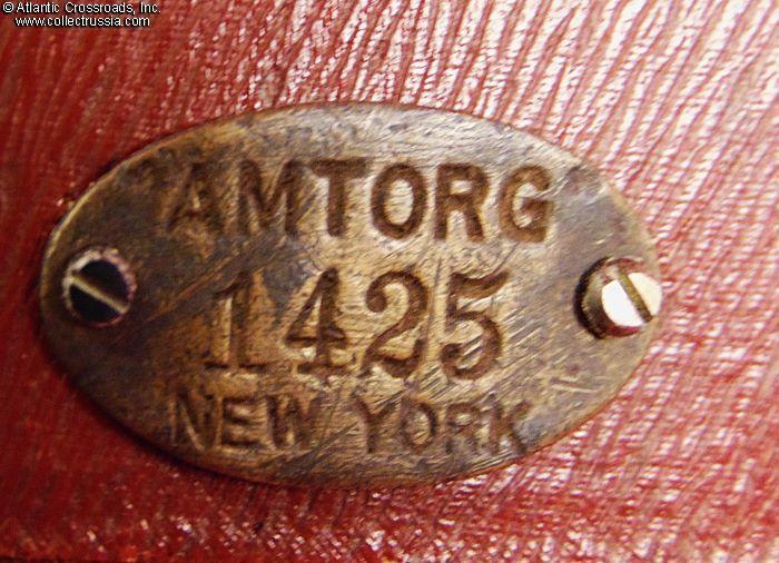 The manufacturer's label inside the camera identifies it as Kodak Rainbow Hawkeye No. 2C model, scarce and uncommon to the point of missing from several publicly available online lists of Brownie camera models. The brass inventory plaque "AMTORG 1425" identifies the camera as belonging to the Soviet AMTORG Trading Corporation, the official Soviet Union trade representative in the USA with offices in New York City. "AMTORG" is an acronym for AMerikanskaya TORGovlya ("American Trade"). The organization was incorporated in the state of New York in May 1924 as the primary sales and p