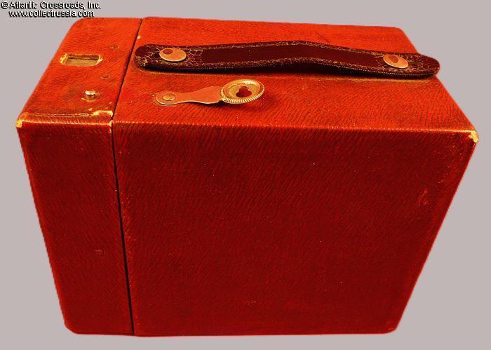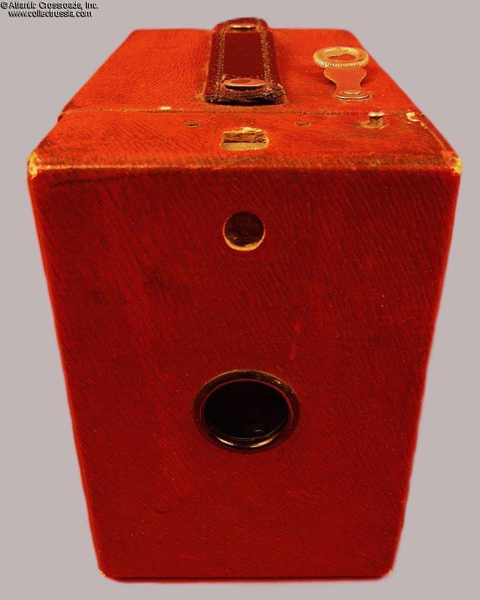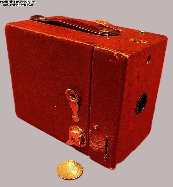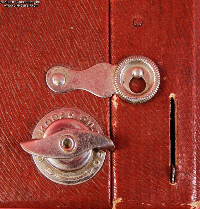 The manufacturer's label inside the camera identifies it as Kodak Rainbow Hawkeye No. 2C model, scarce and uncommon to the point of missing from several publicly available online lists of Brownie camera models. The brass inventory plaque "AMTORG 1425" identifies the camera as belonging to the Soviet AMTORG Trading Corporation, the official Soviet Union trade representative in the USA with offices in New York City. "AMTORG" is an acronym for AMerikanskaya TORGovlya ("American Trade"). The organization was incorporated in the state of New York in May 1924 as the primary sales and purchases agency in the United States even before the US formally recognized the Soviet regime in 1933.
