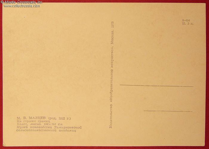 The size is continental standard 6" x 4", unmailable without a cover, published by the Visual Arts Publishing House, Moscow, circulation unknown. The artwork is an offset print of the large 138x164 cm oil-on-canvas painting by M. Maltsev, on exhibit at the Museum of Horse Breeding of the Timiryazev Agricultural Academy in Moscow.