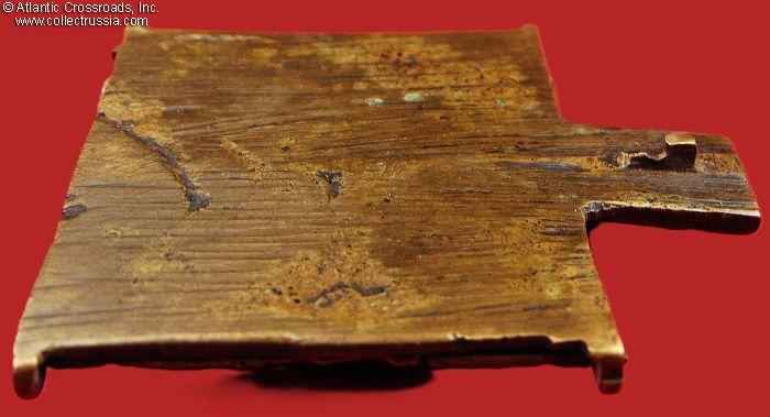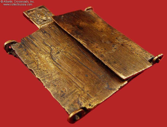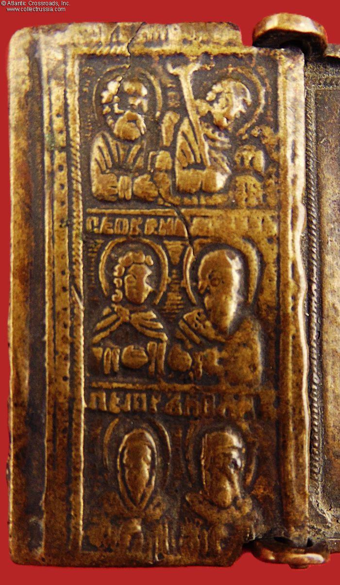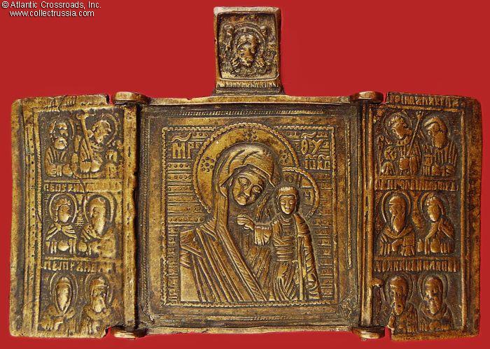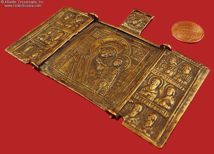 In bronze, weighs nearly 2 oz. The side panels measure 2" x 1" each, the middle panel is 2" square. The central panel depicts the Virgin Mary of Vladimir and Child Christ, with the image of Christ-Not-Made-By-Hand above. The side panels feature various saints, apostles, and archangels. The reverse is unmarked and has the remaining part of a broken loop for threading a cord to wear the icon on your chest.