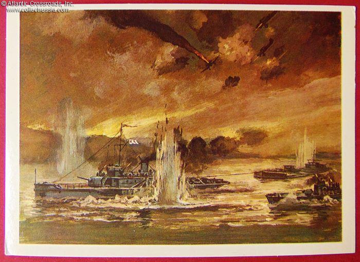 The size is continental standard 6" x 4", unmailable without a cover, published by the Visual Arts Publishing House, Moscow, circulation 140,000. The postcard is No. 9 of a set of annotated art postcards depicting the role and actions of the Soviet Navy during WW2. The artwork is an offset print of a painting by I. Rodinov. The annotation on the verso explains the imagery saying that in 1942 - 1943, the Volga River Flotilla provided escort service to convoys of oil tankers and barges up the river from Astrakhan at the mouth of the Volga up to the port of Saratov, often having to double as tug boats for the barges. During the summer 1943 navigation, 8,000 ships were escorted up the river delivering 7 million tons of oil products, protected from German Luftwaffe bombing raids by the antiaircraft guns of the Volga Flotilla ships.