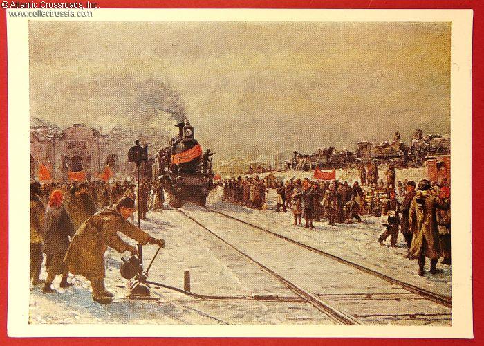 The size is continental standard 6" x 4", postally unused and unmarked; published by the Soviet Artist Publishing House, circulation unknown. The artwork is an offset print of the 1931 painting by N. Terpsikhorov depicting the strong military presence on the Soviet railways.