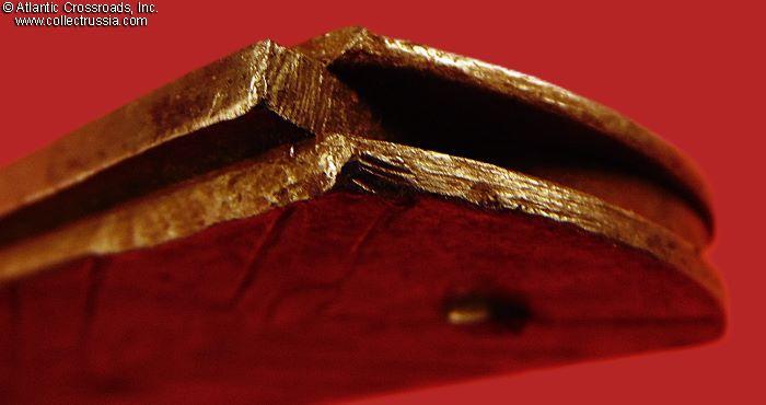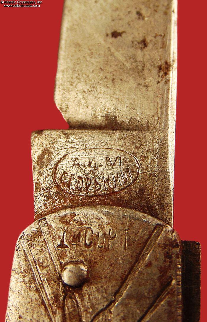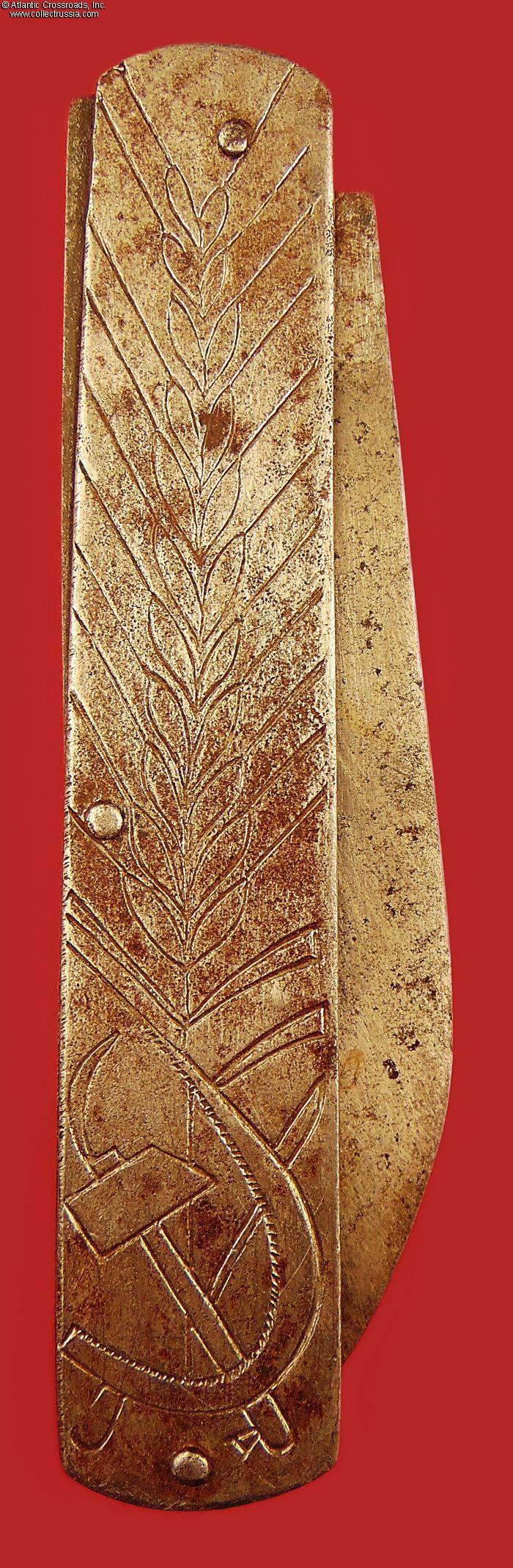 In steel, the handle measures 5" long, the blade is 3 ½" long. The maker's mark АИМ is the Russian abbreviation for Workshop of Invalids "Metallist" in the city of Gorky, modern-day Nizhniy Novgorod. The stamped "1 СОРТ" on the handle next to the tang is the top quality rating by Quality Control. The handle is engraved on both sides with the Soviet hammer-and-sickle emblem and a stalk of wheat. Inexpensive and simple, these knives were colloquially called "the collective farmer's knife." Workshops like the "Metallist" were a lifeline to many Soviet disabled war veterans lucky to find such work, manufacturing or repairing simple objects of everyday necessity.
