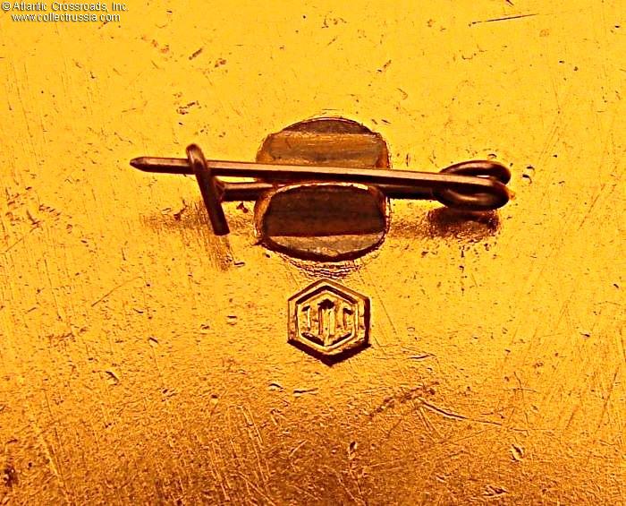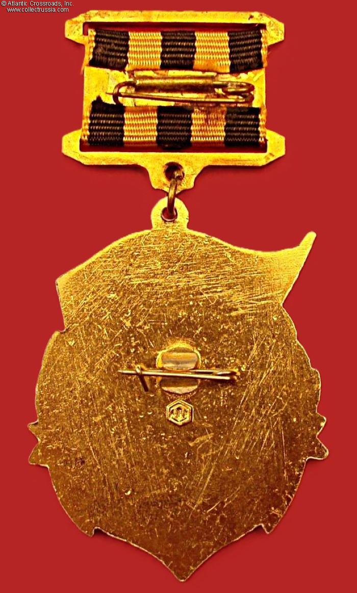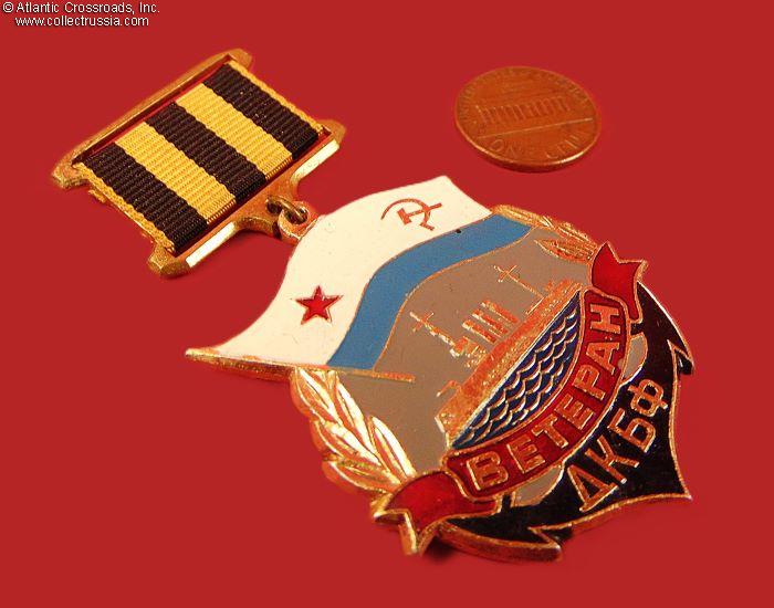 The medallion is in aluminum and paints, 49.1 mm tall x 38.4 mm wide. The suspension device is in brass, with cloth ribbon representing the Order of Glory or Medal for Victory over Germany. The medallion shows the Avrora cruiser at sea under a large Soviet naval ensign. Under the image of the cruiser are the words BETEPAH ("veteran") and ДКБФ ("DKBF", Russian abbreviation for "Twice Order of the Red Banner Baltic Fleet"). The reverse has a raised maker mark of the Pobeda Factory in Moscow. An unusual feature of this badge, besides its large size, is that both the medallion and suspension device have their own pin attachment so that the medallion would not swing while being worn by the owner.