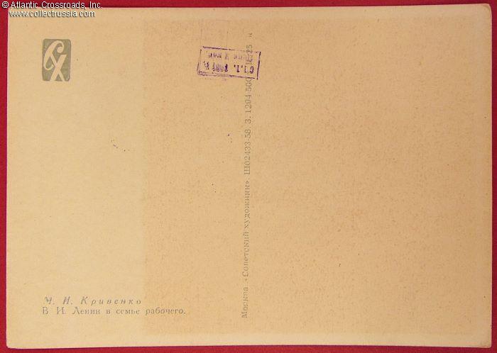 The size is continental standard 6" x 4", postally unused and unmarked, possibly part of a series or a set. Published by the Soviet Artist Publishing House, Moscow; circulation 500,000. The artwork is an offset print of a painting by M. Krivenko depicting Lenin visiting a worker's household and, apparently, explaining something to the family - most likely, how blissfully happy they would be in the workers' paradise.