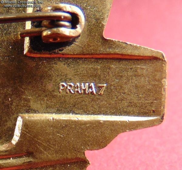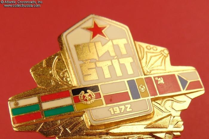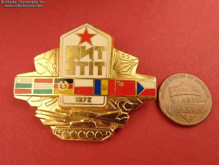 Brass, enamels. Large piece, measures 39.6 x 46.4 mm. Shows rockets, tank, airplane and other weapons, with flags of 7 participating countries in a horizontal line across the badge. Raised maker mark "Zukov Praha7" to the reverse.