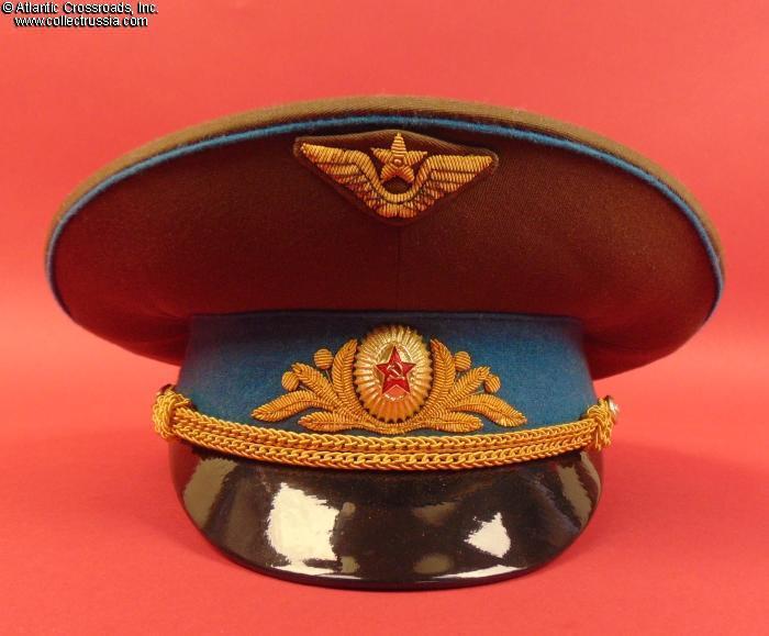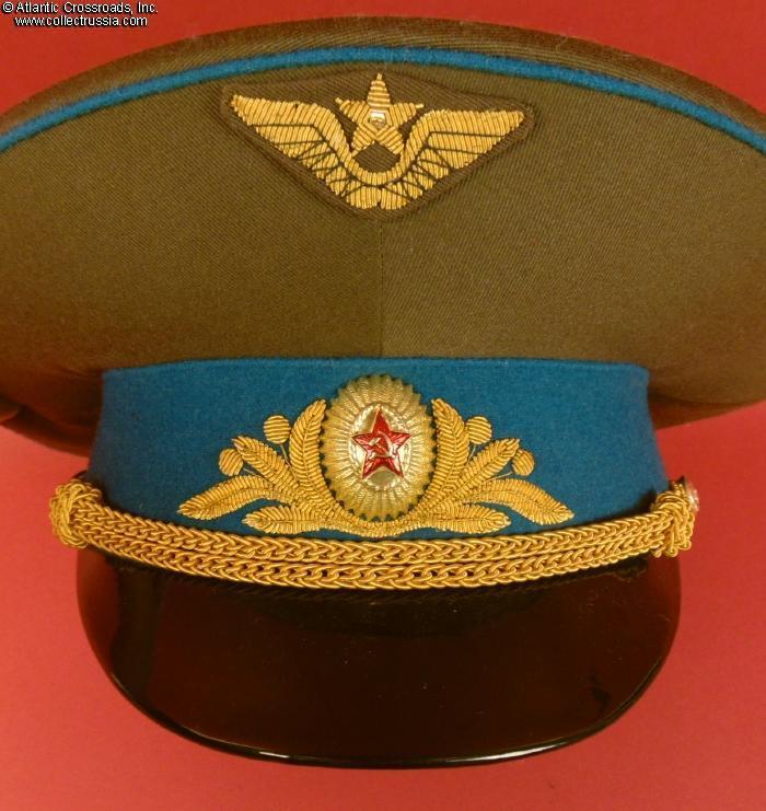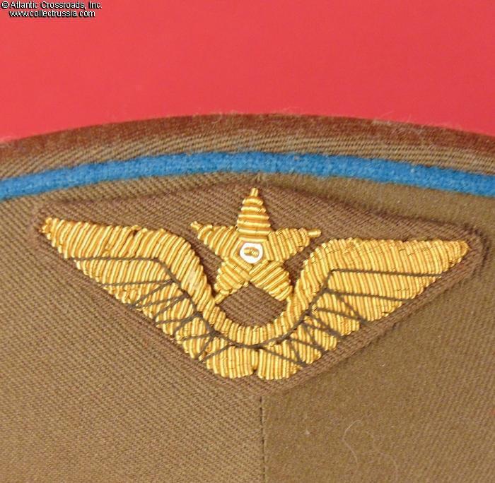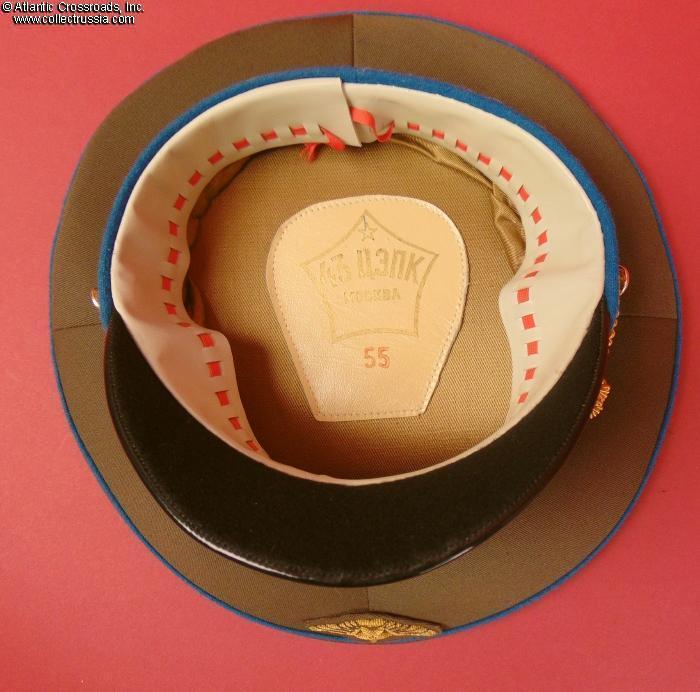 In olive drab wool gabardine with sky-blue band and piping. Gold embroidery around the hat badge and gold embroidered Air Force wings on the crown. Gold filigree chin cord. Features characteristically large "oversized" crown and patent leather visor with felt underside. Red silk tape threads through the leather sweatband to allow a customized fit, a feature unique to general officer hats. The two-piece hat badge is also the type specific to generals. The leather sweat shield shows the logo of the Moscow TsEPK Factory of the Ministry of Defense without the date of manufacture, as typical of the general officer hats produced after 1987. The label is marked 55 for size (Small, US size 6 7/8).