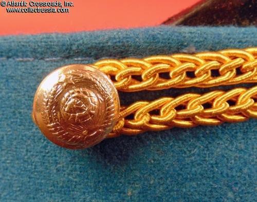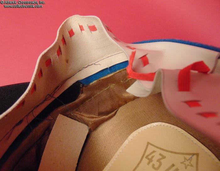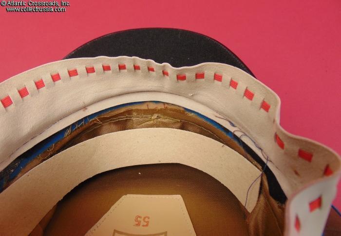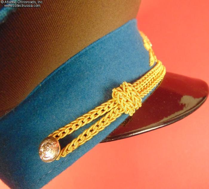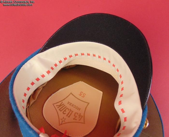 In olive drab wool gabardine with sky-blue band and piping. Gold embroidery around the hat badge and gold embroidered Air Force wings on the crown. Gold filigree chin cord. Features characteristically large "oversized" crown and patent leather visor with felt underside. Red silk tape threads through the leather sweatband to allow a customized fit, a feature unique to general officer hats. The two-piece hat badge is also the type specific to generals. The leather sweat shield shows the logo of the Moscow TsEPK Factory of the Ministry of Defense without the date of manufacture, as