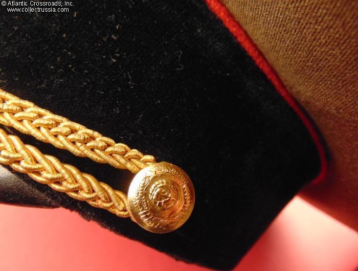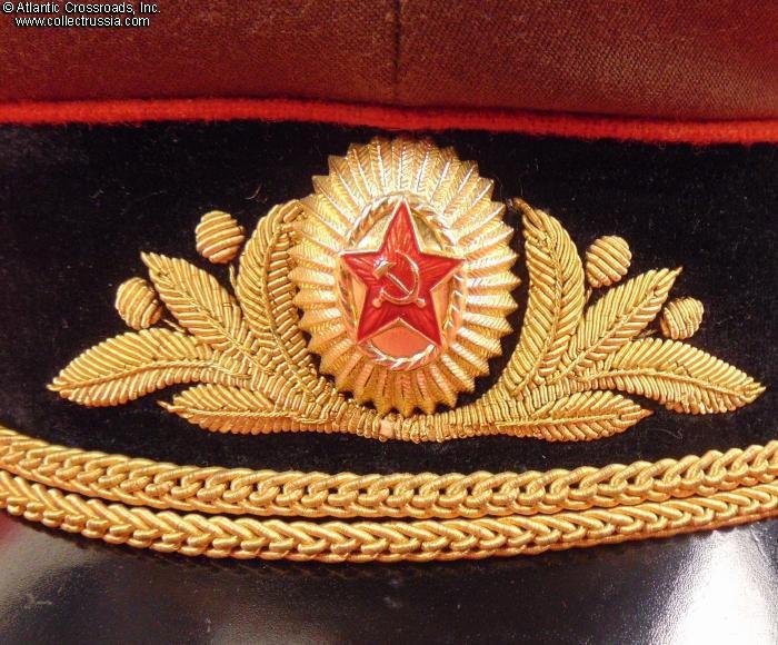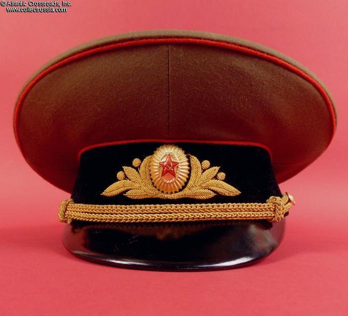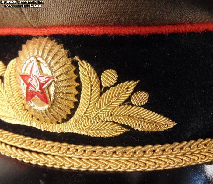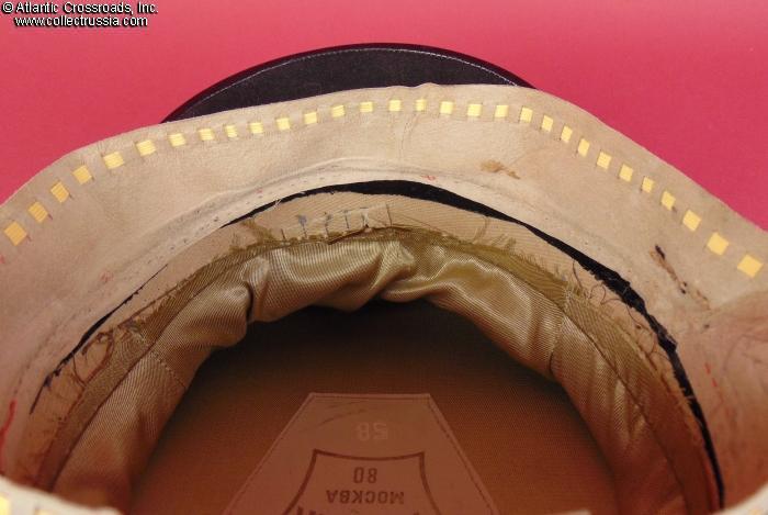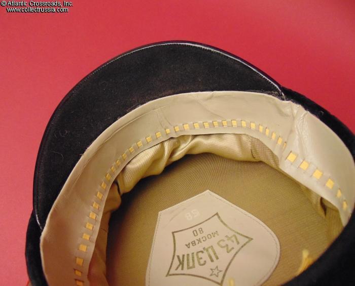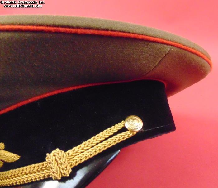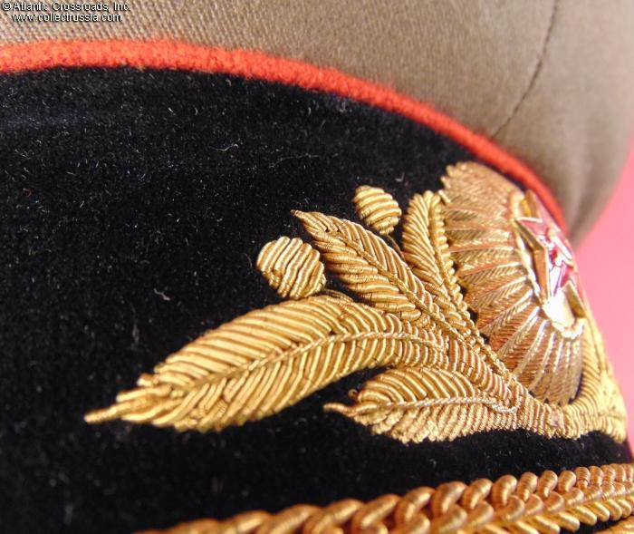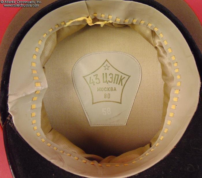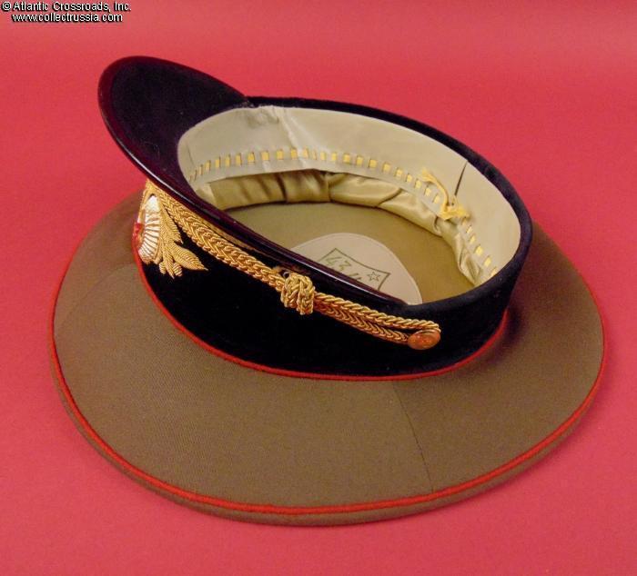 In olive drab wool gabardine with black velvet band and red piping. Gold filigree chin cord. Gold embroidery around the hat badge, patent leather visor with felt underside. Yellow silk tape threads through the leather sweatband to allow a customized fit, a feature unique to general officer hats. The two-piece hat badge is likewise the type specific to generals. Moscow TsEPK factory's leather sweat label shows a 1980 date of manufacture and size 58 (US 7 ¼ - Large). There is a quality control stamp to the suede underside of the sweat band.