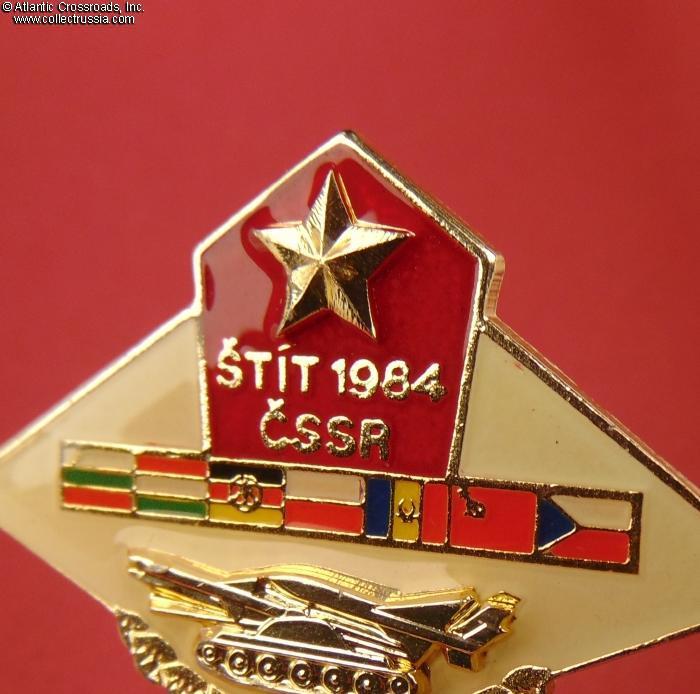 Manufactured in Czechoslovak Socialist Republic. The badge was issued to officers who took part in the large-scale Warsaw Pact war games in 1984, at the height of the Cold War tensions (at the time, the Soviet high command had become paranoid about the possibility of a first nuclear strike by NATO, and the world had come as close to nuclear war as ever). The version with a beige background is far more scarce than the one with the red background.