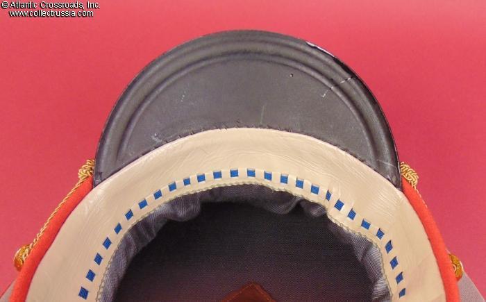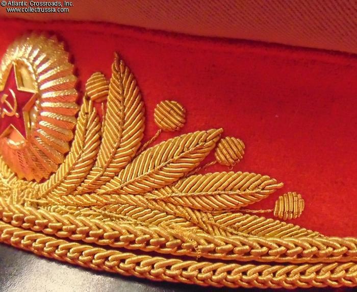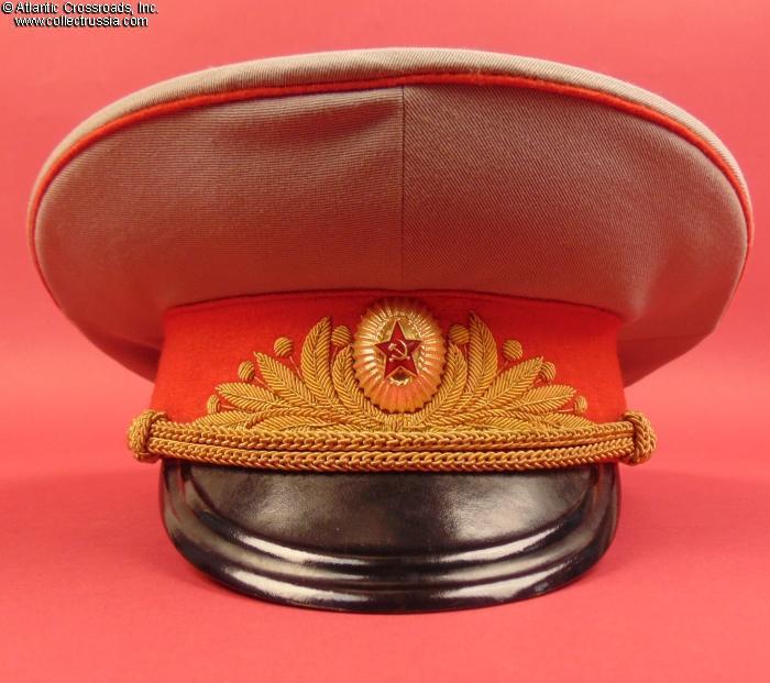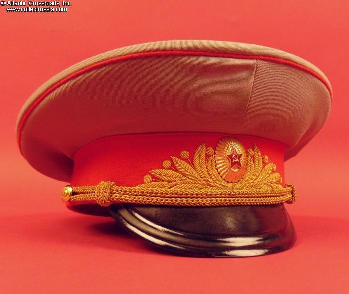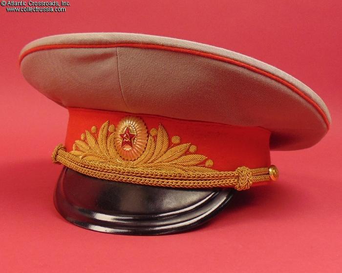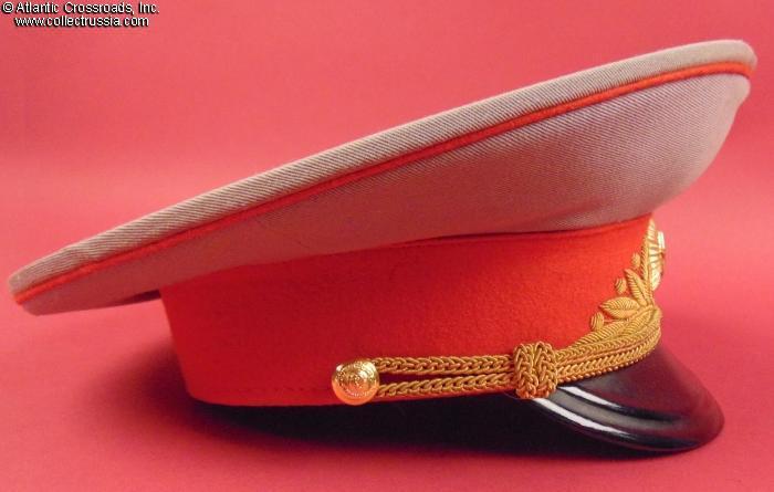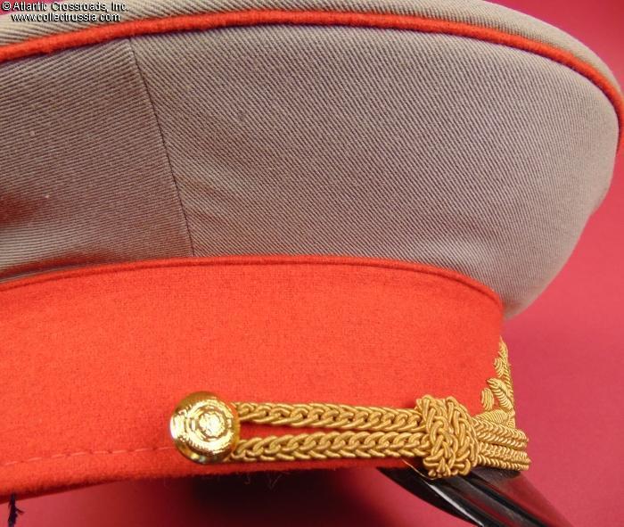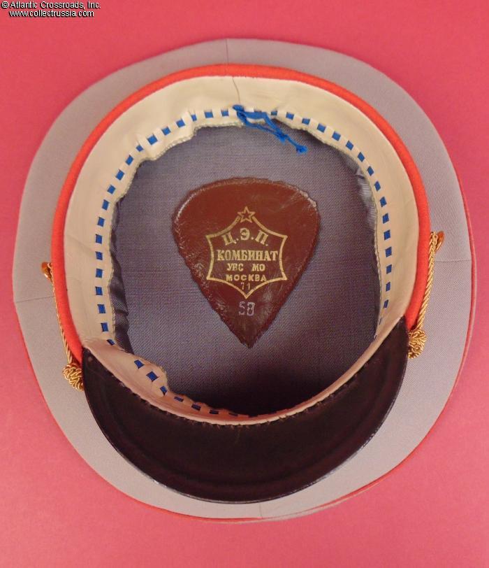 In light gray wool gabardine with red piping and band, gold embroidery on the band, and gold filigree chin cord. The crown is of a relatively early style, not as small as the hats from the 50s-60s, but noticeably smaller than the oversized crowns of the general hats from the 80s. The visor is in hard plastic with polished top and matte underside, as correct for the hats of early vintage. Blue silk tape threads through the general quality leather sweatband to allow a customized fit. The two-piece hat badge is of the type specific to generals. The teardrop-shaped sweat label shows the early TSP Moscow maker's mark, a 71 date of manufacture, and a size 58 (equivalent of US size 7 ¼ - Large).