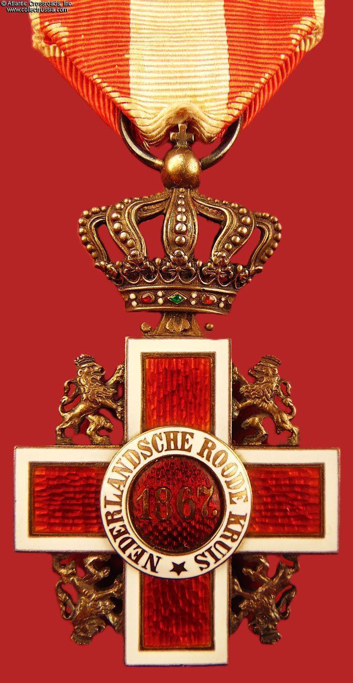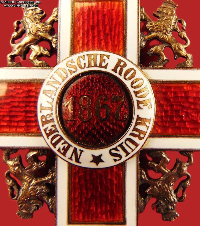 In silver gilt, enamels, measures 64.1 in height (incl. crown), 39.3 mm in width. Suspended from a royal crown and ring worn on a threaded ribbon which appears to be original, in red and white moiré silk. The year1867 on the reverse is the year of establishment of the Netherlands Red Cross.